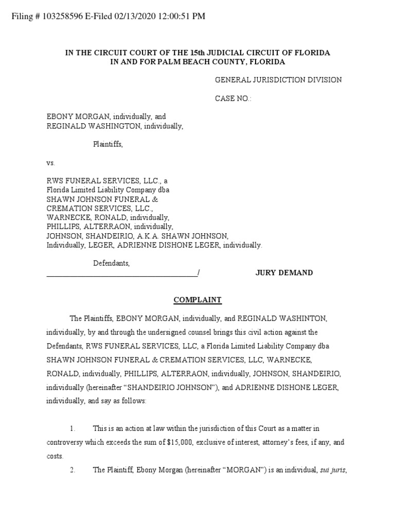 31 Shawn Johnson allegedly refused to allow Ebony Morgan. On 02132020 MORGAN EBONY filed a Contract - Business lawsuit against RWS FUNDERAL SERVICES LLC. ReAsia Washingtons family claims that Shawn Johnson Funeral and Cremation known for its services for many of Palm Beach Countys homicide victims and the subject of a.